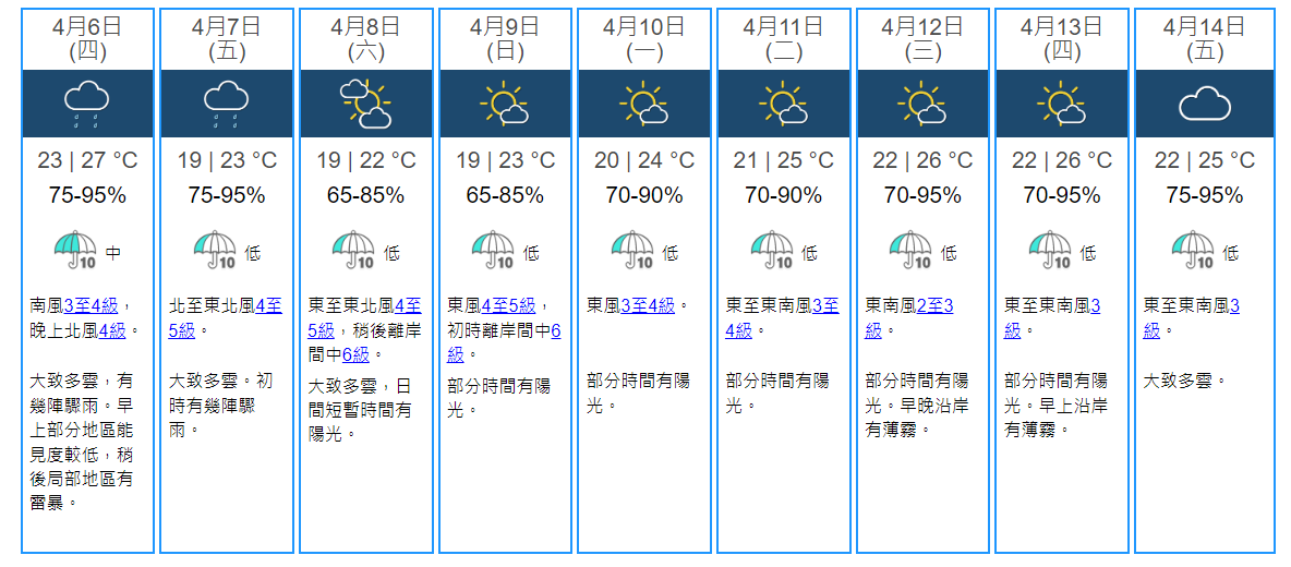 本港連日來落雨潮濕,天文台預測,明日(6日)將迎來一道冷鋒夜襲,明後兩天仍有驟雨。復活節前夕雨停見陽光,其後氣溫升至最高攝氏26度。