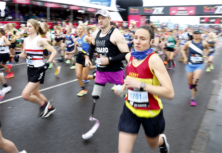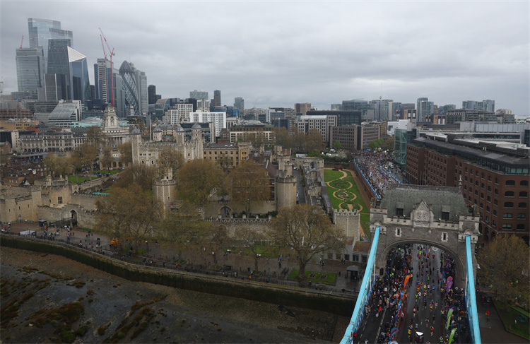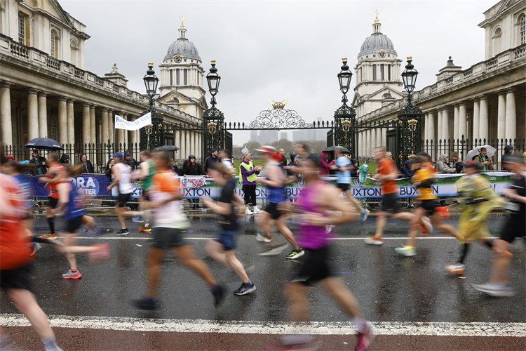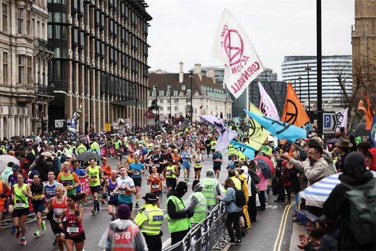 比賽依然是在傳統路線進行。從本初子午線所在地格林威治公園開始,途徑倫敦塔橋、大笨鐘、海德公園等倫敦著名的地標建築,終點設置在白金漢宮前的林蔭大道。今年至少有45000位選手參加,高於2022年的40643人,成為有史以來最大規模的倫敦馬拉松。圖源:路透社