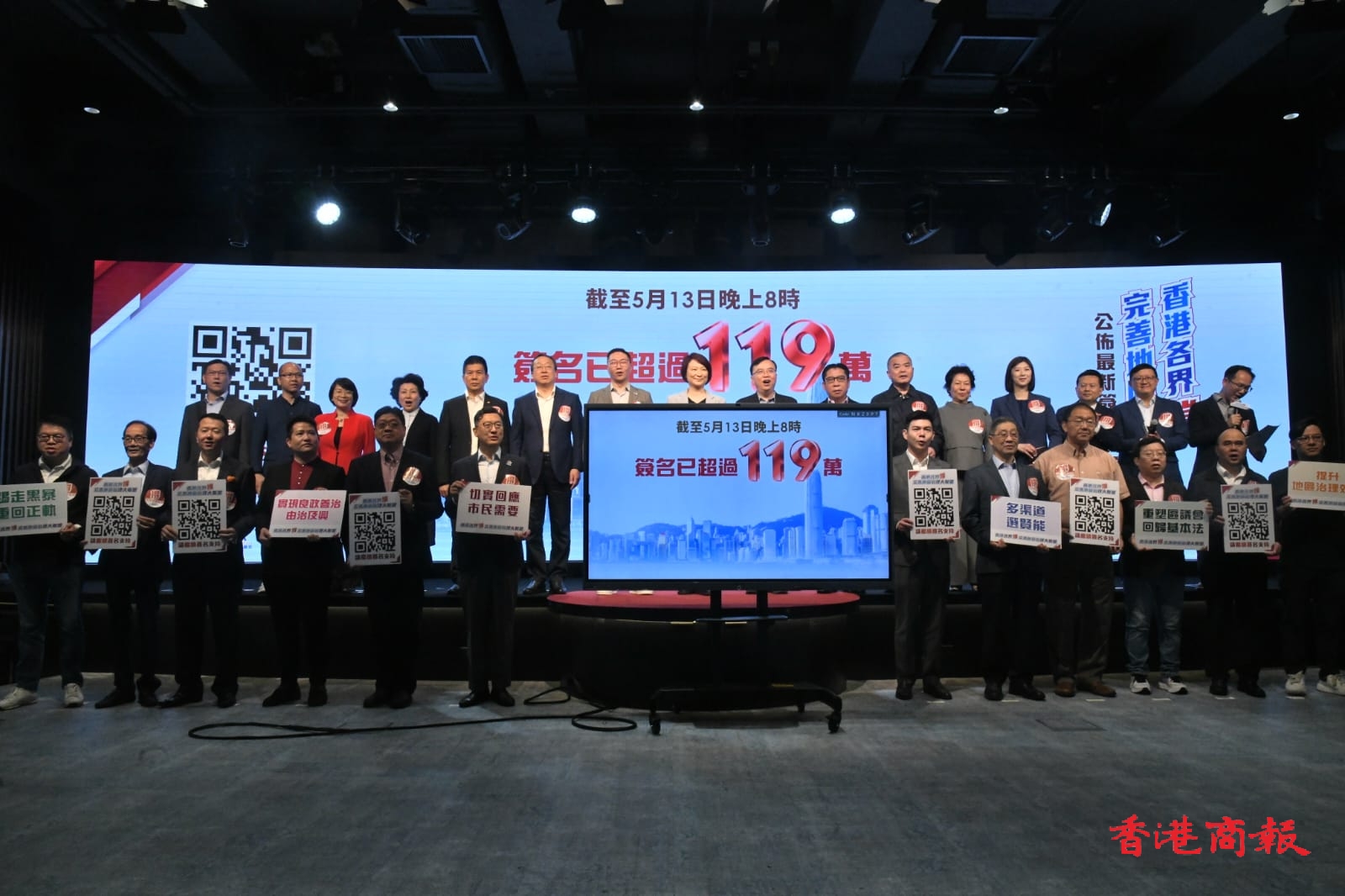 由多個政黨團體組成的「香港各區撐完善地區治理大聯盟」,自5月5日開始在全港18區發起支持完善地區治理方案的簽名行動。大聯盟今日(14日)宣布,截至昨晚(13日)8時,已收集了1190760名市民簽名,當中線下佔881898人,線上佔308862人。身兼大聯盟總召集人的全國人大常委、民建聯主席李慧琼表示,數字證明政府的方案符合市民期望,得到社會廣泛認同。