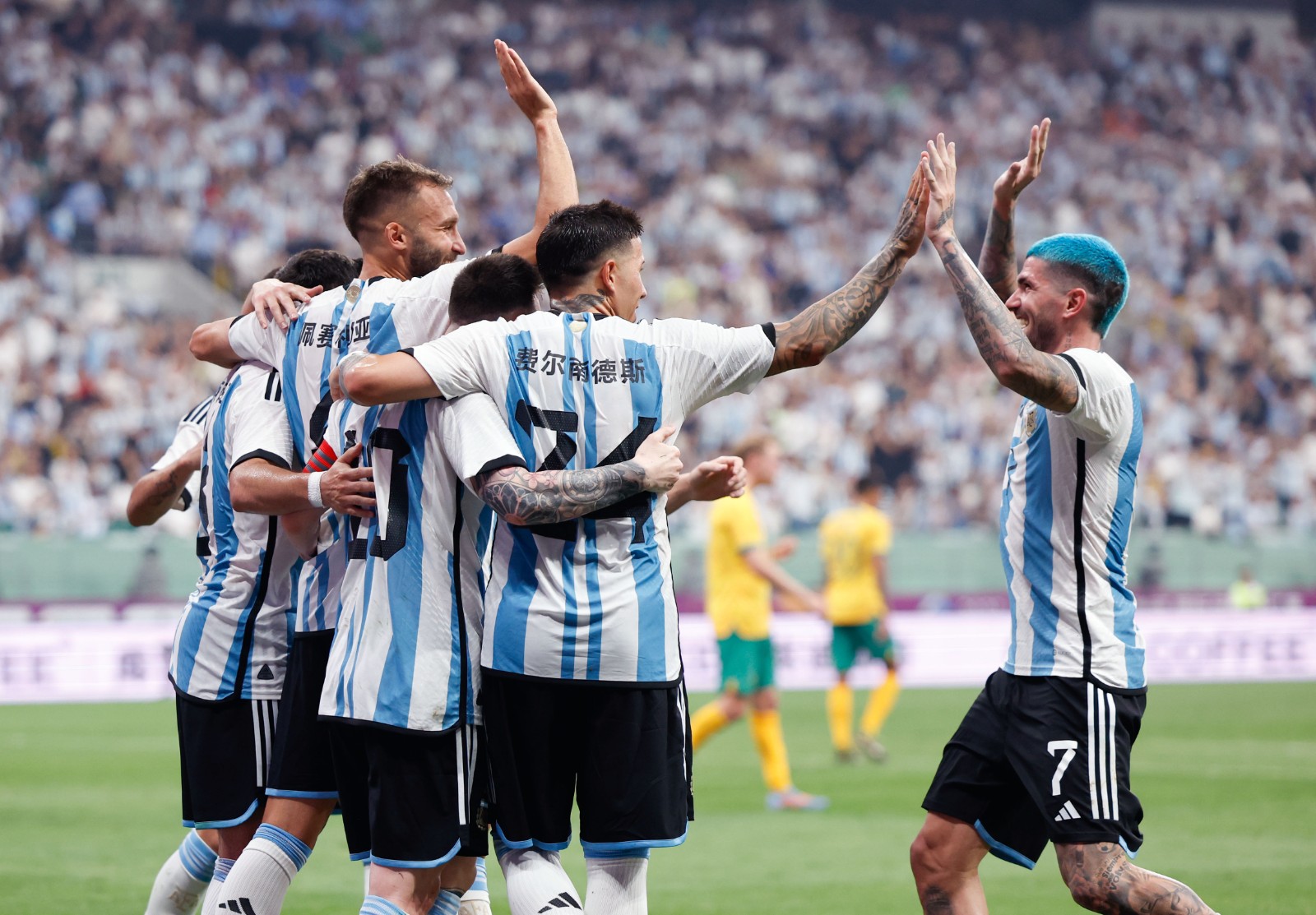 今晚(15日)在北京工人球場上演的國際足球友誼賽,阿根廷憑着踢足90分鐘的美斯,於開賽81秒的閃電入球,加上比斯拿下半場頭槌建功,最終以2比0擊敗澳洲。
