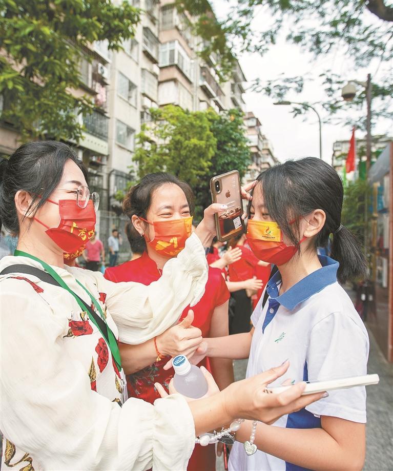 深圳中考首日,在桂園中學考點,家長們為考生加油打氣。 深圳特區報記者 賴犁 程海昆 攝