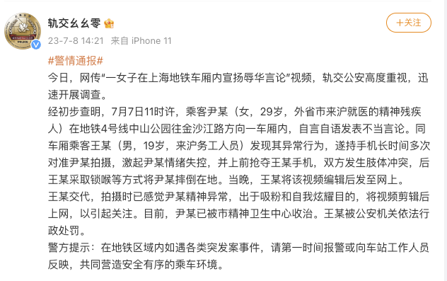 經初步查明,7月7日11時許,乘客尹某(女,29歲,外省市來滬就醫的精神殘疾人)在地鐵4號線中山公園往金沙江路方向一車廂內,自言自語發表不當言論。同車廂乘客王某(男,19歲,來滬務工人員)發現其異常行為,遂持手機長時間多次對準尹某拍攝,激起尹某情緒失控,並上前搶奪王某手機,雙方發生肢體衝突,後王某採取鎖喉等方式將尹某摔倒在地。當晚,王某將該視頻編輯後發至網上。