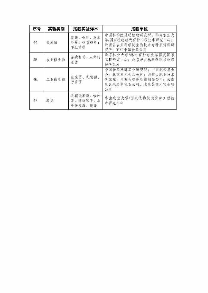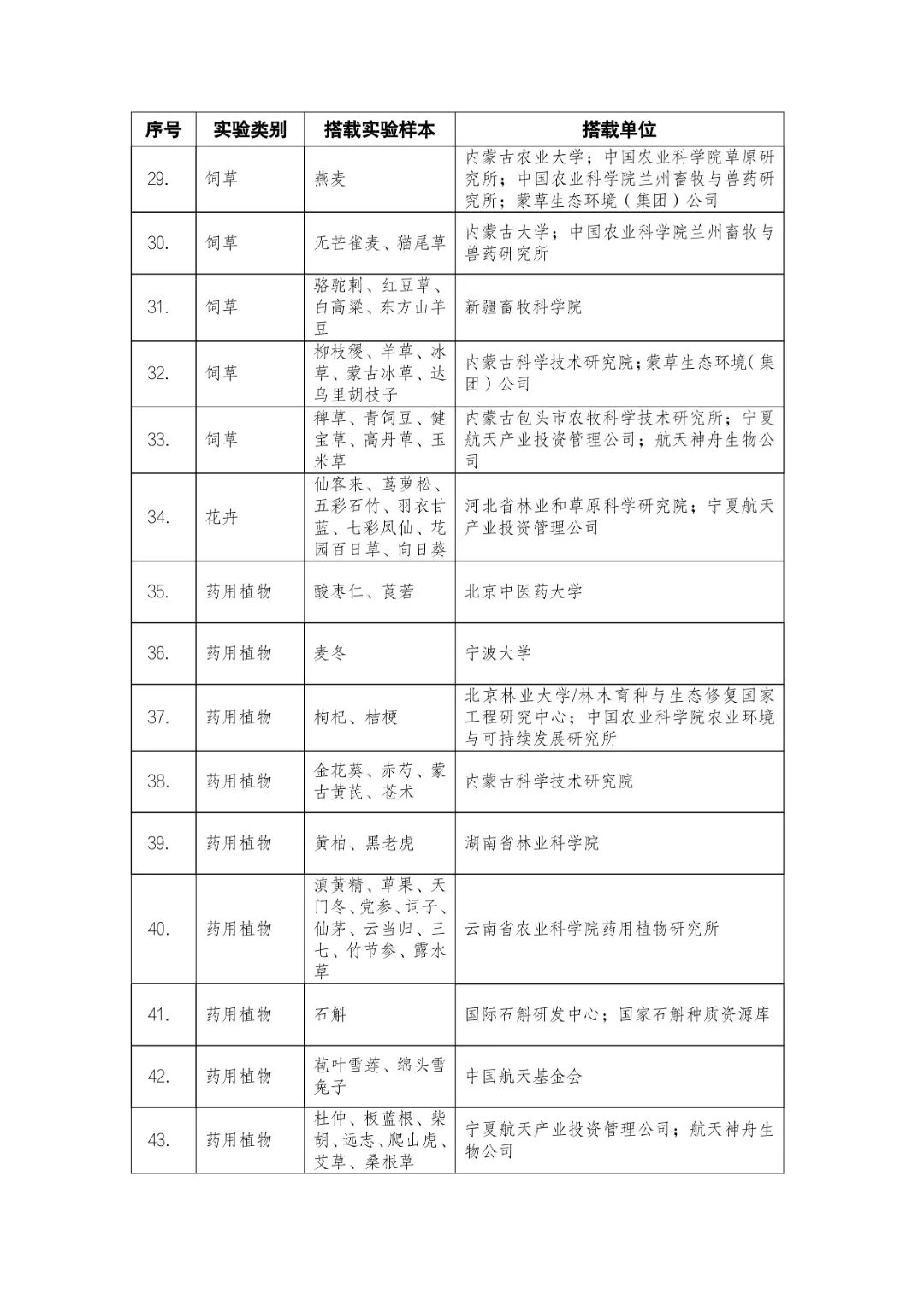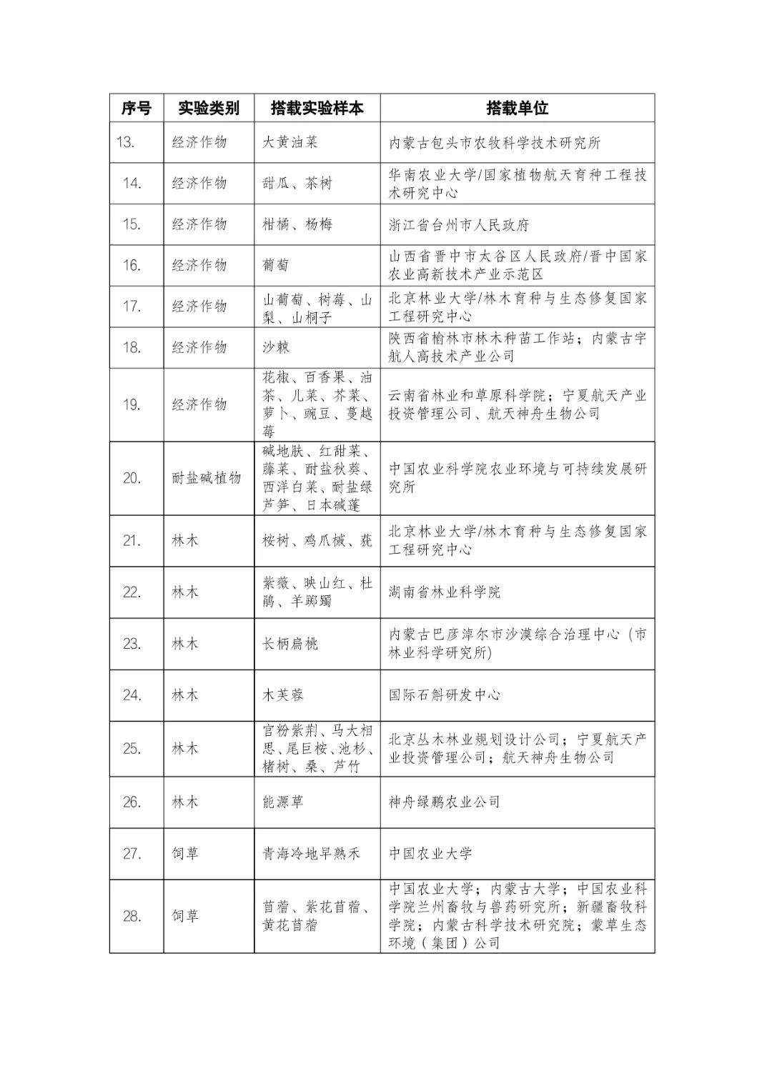 載人航天工程立項實施以來,始終注重提升工程綜合效益,致力服務國家經濟社會發展。在工程歷次飛行任務中,均安排了航天育種搭載實驗項目。從神舟十六號載人飛船開始,中國載人航天工程辦公室向社會公開徵集航天育種搭載實驗項目,於3月23日在工程官網發布《關於徵集神舟系列載人飛船航天育種實驗項目的機會公告》,同時在工程官網開闢「航天育種搭載實驗」管理平台,接受搭載需求單位申報實驗項目。辦公室組織專家對申報項目進行評審,遴選出53個單位的136種份航天育種實驗材料實施搭載。包括農作物47份(糧食作物種子12份、經濟作物種子28份、耐鹽鹼植物7份);林草、花卉和藥用植物76份(林木17份、飼草21份、花卉7份、藥用植物31份);微生物和其它13種(農業微生物菌種2種、工業微生物菌種3種、食用菌3種、藻類和苔蘚5種)(清單附後)。