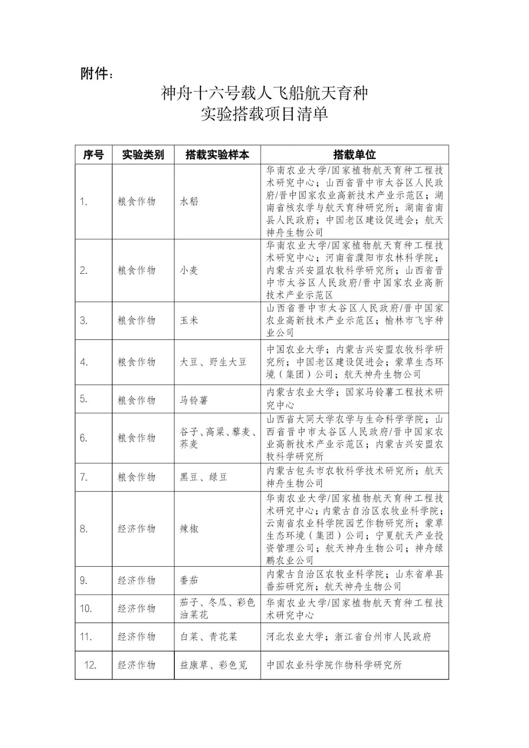7月19日,中國載人航天工程辦公室公布神舟十六號載人飛船航天育種實驗項目清單,詳情如下: