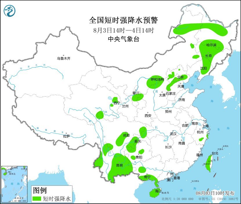 中央氣象台8月3日10時繼續發布暴雨藍色預警,預計8月3日14時至4日14時,內蒙古東北部和中部偏南、黑龍江、吉林中北部、河北北部、北京西南部和東北部、山西北部、廣西南部沿海、海南島南部、雲南中南部和西部、西藏東南部、青海東北部及浙江東部沿海、台灣島等地有大到暴雨。