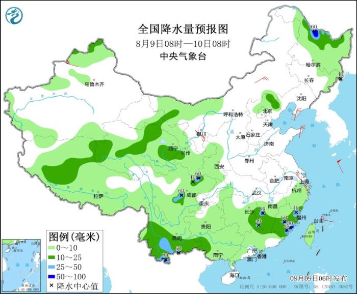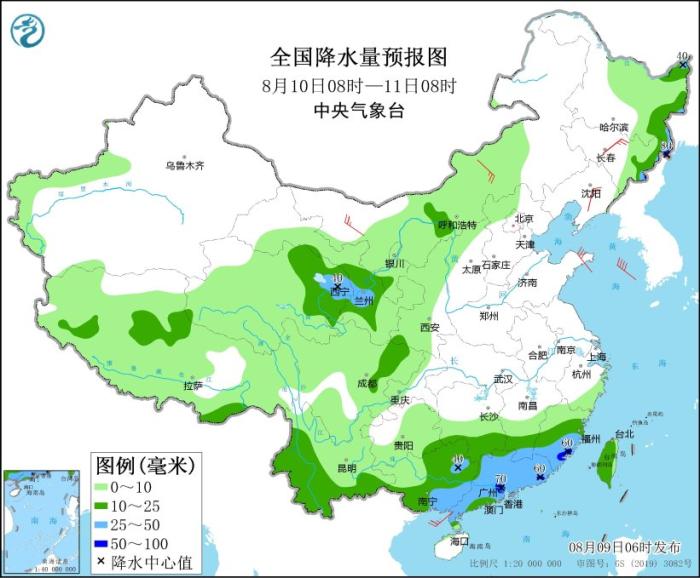 圖1 全國降水量預報圖(8月9日08時-10日08時)