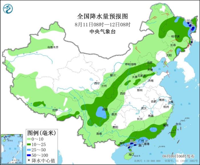 8月11日08時至12日08時,內蒙古東北部、黑龍江、吉林中東部、甘肅東部、陝西中北部、山西、河北中部和南部、北京、四川盆地中西部、廣西東部和南部、廣東、福建南部、台灣島等地部分地區有中到大雨,其中,黑龍江東北部、吉林東部、廣西南部沿海、廣東西南部等地部分地區有暴雨(50~80毫米)。內蒙古東部、黑龍江東部、吉林中東部、遼寧中東部、山東半島等地部分地區有4~6級風(見圖3)。