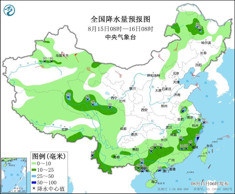 圖1 全國降水量預報圖(8月15日08時-16日08時)