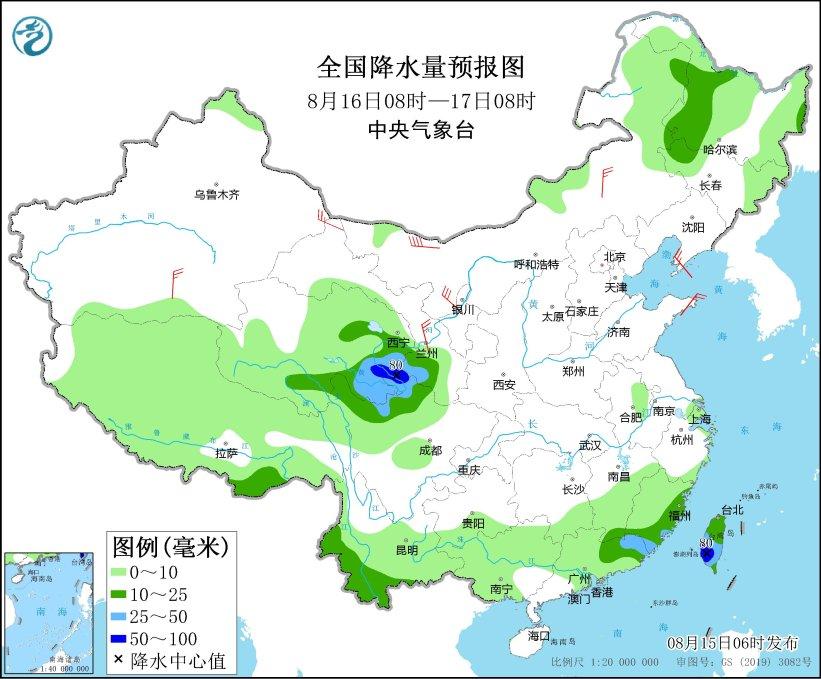 8月16日08時至17日08時,黑龍江西部、青海東部、甘肅東南部、川西高原北部、西藏東南部、雲南西南部、廣東東部、福建東部和南部、台灣島等地部分地區有中到大雨,其中,青海東南部、甘肅南部、台灣島南部等地部分地區有暴雨(50~80毫米)。新疆南疆盆地、內蒙古中西部、甘肅、遼東半島、山東半島等地部分地區有4~6級風(見圖2)。