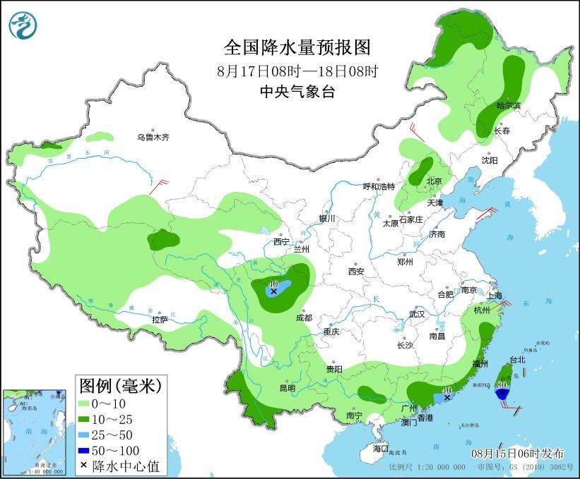 8月17日08時至18日08時,內蒙古東北部、黑龍江中西部、吉林西部、青海西部和東南部、甘肅南部、川西高原北部、河北北部、浙江東南部、福建東部沿海、雲南西南部、廣東東部、台灣島等地部分地區有中到大雨,其中,台灣島南部等地部分地區有暴雨(50~80毫米)。內蒙古東部、新疆南疆盆地、山東半島等地部分地區有4~6級風(見圖3)。