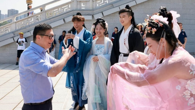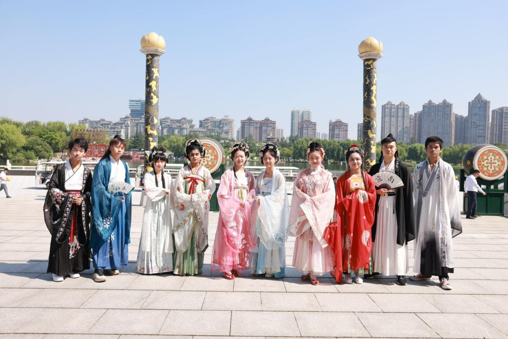 另外,一行人今日還前往充滿唐朝特色的「大唐芙蓉園」參觀,學員趁機試穿漢服,感受穿越千多年前盛世長安的滋味,其中幾位非華裔同學不只是第一次前往內地,更是第一次穿上漢服、換上唐朝的妝容。鄧炳強向各位學員抱拳行禮。