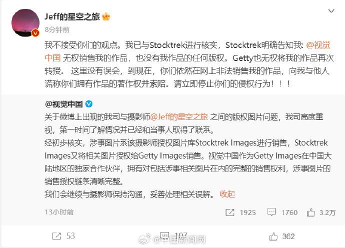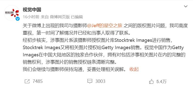 8月16日,戴建峰轉發視覺中國此前的解釋聲明,並稱不接受視覺中國將此事定性為「誤解」,要求視覺中國立即停止侵權行為。其在回應中明確指出「我已與stocktrek進行核實,stocktrek明確告知我: 視覺中國無權銷售我的作品,也沒有我作品的任何版權。getty也無權將我的作品再次轉授。」