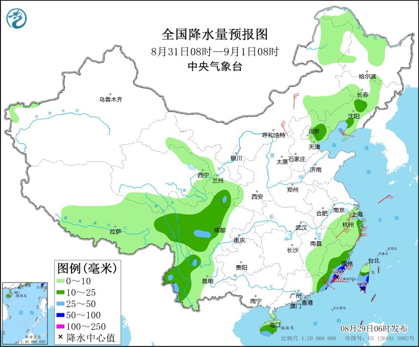 8月30日08時至31日08時,黑龍江西北部、蘇皖南部、上海、浙江大部、福建北部、雷州半島、雲南西部、海南島、台灣島等地的部分地區有中到大雨,其中,雲南西部、海南島西北部和東南部、台灣島東南部等地局地有暴雨或大暴雨(100~240毫米)。內蒙古中部和西部、遼東半島、山東半島、浙江東部沿海等地的部分地區有4~6級風(見圖3)。