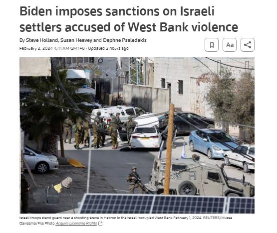 據路透社報道,拜登1日簽署了一項行政命令,宣布全國進入緊急狀態,允許其採取新措施打擊定居者的暴力行為,同時宣布對在約旦河西岸實施暴力行為的四名以色列極端分子實施制裁。