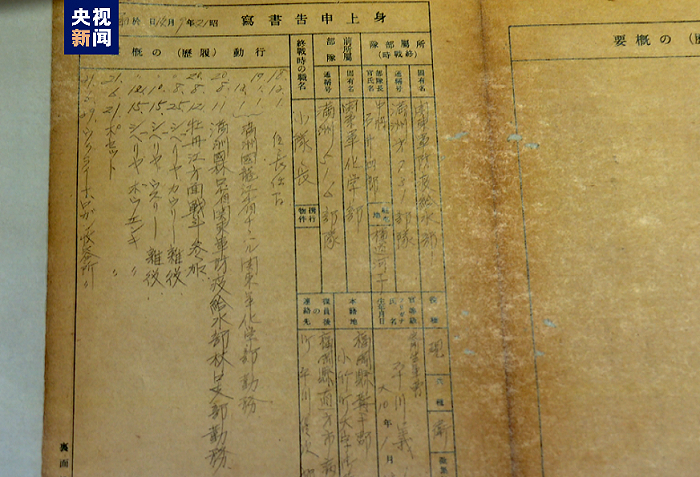 侵華日軍第七三一部隊罪證陳列館研究人員 金士成:當731部隊獲得撤退命令的時候,他們可能在外地出差或者公出,沒有在哈爾濱本部,他們已經來不及跟本部一起撤回到日本。日本海外所有部隊回國之後,都要登記身上申告書,否則軍籍沒法被實現,沒法被認可,有很多的養老金沒法兌現。 52名沒有跟隨大部隊整體撤離的成員中,14人被拘捕羈押到前蘇聯境內,38人隱藏身份混跡在中國各地。第二次世界大戰結束後,他們以個人為單位回到日本後,填寫了個人情況登記表,便是這次公開的《731部隊本部身上申告書》。