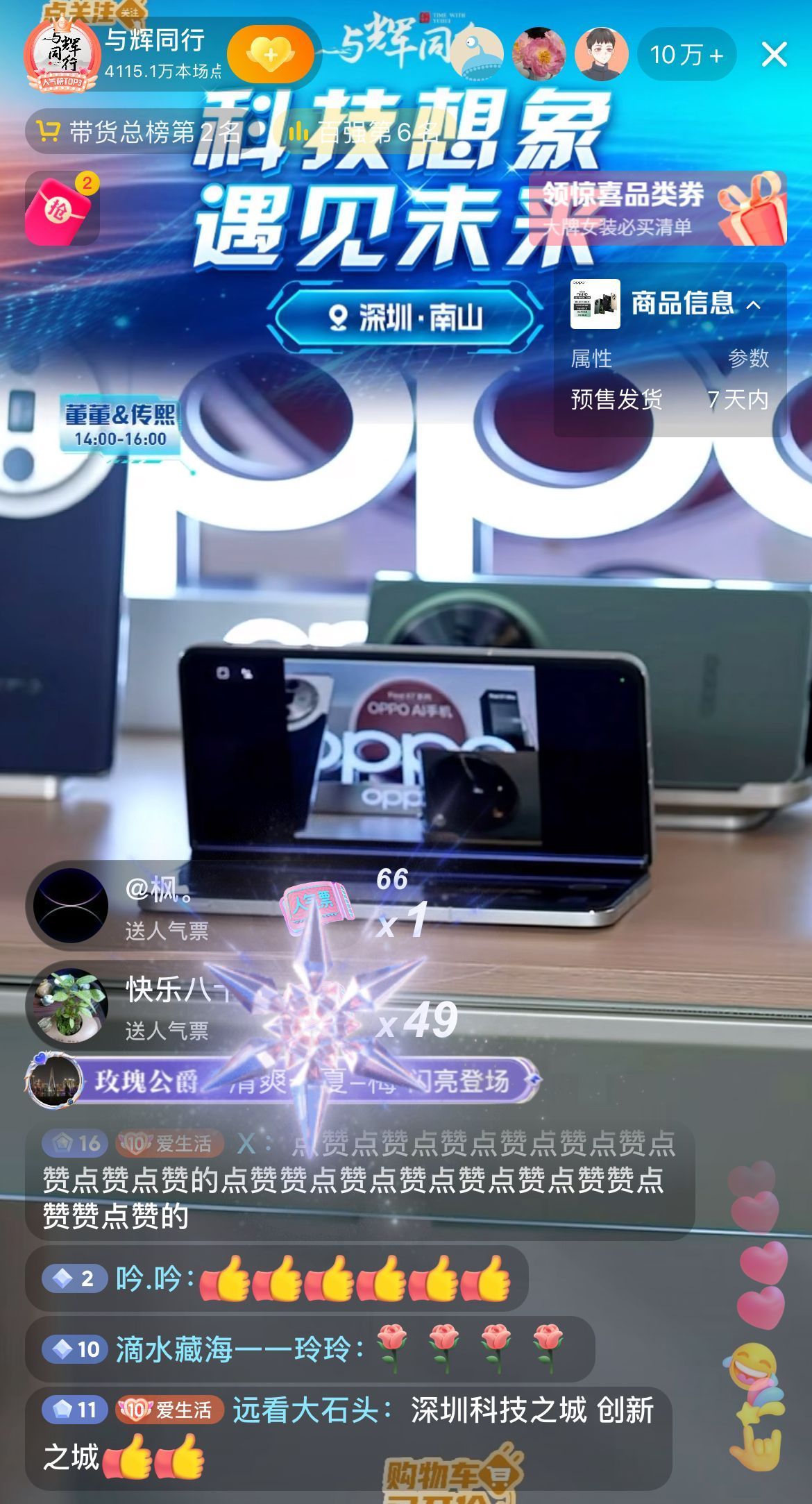 董宇輝介紹的首款商品為OPPO Find N3 AI手機,直播間刷屏不斷: 「深圳丈母娘,使勁兒沖」「深圳科技之城,創新之城」…...