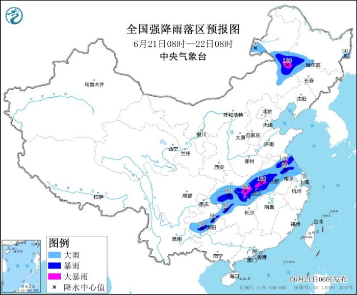 預計,6月21日08時至22日08時,江淮大部、江漢大部、河南南部、湖南北部和西部、重慶東部、貴州西南部和中部以及內蒙古東北部、黑龍江西南部和東部、吉林西部等地部分地區有大到暴雨,其中,湖北東部和南部、安徽西部、江蘇北部、內蒙古東北部、吉林西部等地局地有大暴雨(100~180毫米)。上述部分地區伴有短時強降水(最大小時降雨量30~60毫米,局地可超過80毫米),局地有雷暴大風等強對流天氣。