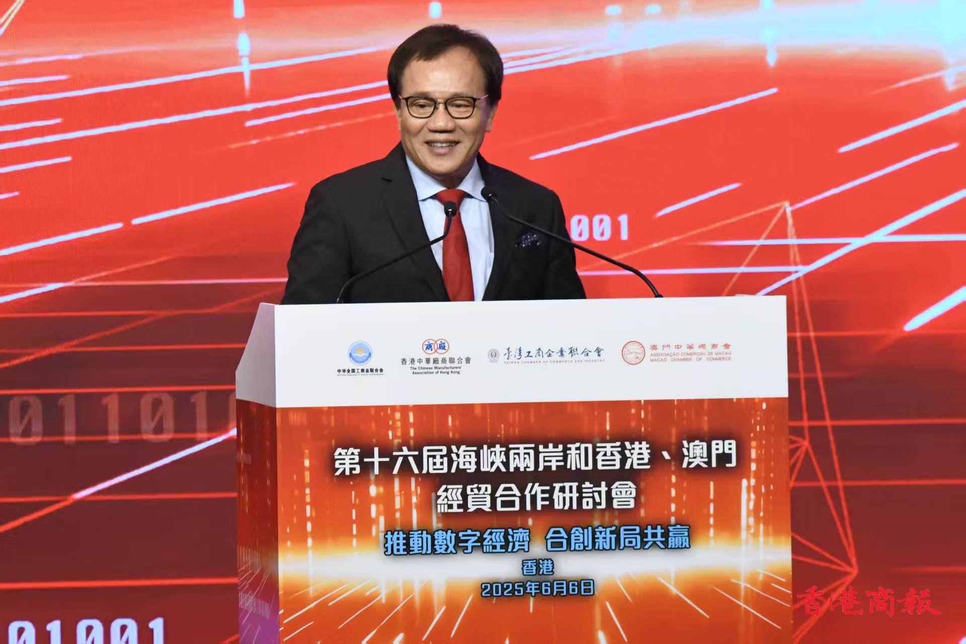 由香港中華廠商聯合會籌辦,聯同中華全國工商業聯合會、台灣工商企業聯合會和澳門中華總商會主辦的第十六屆海峽兩岸和香港、澳門經貿合作研討會,今日(6日)於灣仔會展舉行。身兼全國政協副主席的中華全國工商業聯合會主席高雲龍、廠商會會長盧金榮、台灣工商企業聯合會理事長王明祥,以及澳門中華總商會會長崔世昌出席活動並致辭。