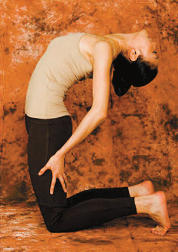 雙膝跪地,與骨盆同寬,腳趾點地,大腿和上身保持直立。用雙手抓住大腿,大拇指朝前。呼氣,低頭,下巴盡量接近胸前。緩慢而深長地吸氣,同時將頭部后仰,打開胸部,臀部收緊向前推,脊椎后彎到最大限度。呼氣的同時回到原來體位,并重復練習。