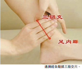 三陰交:脾、肝、腎三條經脈交會之處,重點點揉此穴可以通暢三經,而脾統血、肝藏血、腎藏精主生殖,均與女性生殖密切相關,故通脾經自點揉此穴開始。自三陰交起,沿脛骨后緣向上依次點按,直至近膝關節的陰陵泉穴止,反覆治療10次后換另外一條腿,繼續點按。