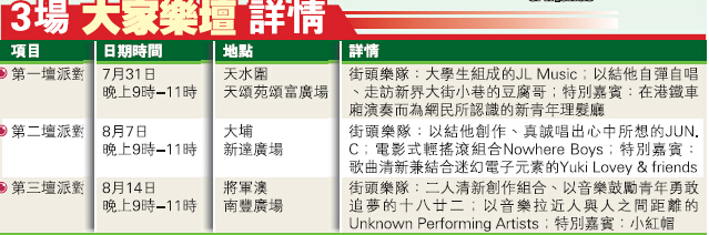 三場「大家樂壇」分別於7月31日、8月7日及8月14日在天水圍、大埔及將軍澳舉行,每場均邀請兩隊人氣街頭音樂樂隊,連同一組特別嘉賓撐場與大家同場JAM歌。顧客只需要捐贈慈善價30元(每場),便可齊齊欣賞街頭音樂,並享用美食及飲品。大家樂更透過在天水圍的社福機構邀請區內青少年一同參與首場派對,讓他們一同感受街頭音樂散發的正能量。所有善款將捐贈予基督教香港信義會天水圍青少年綜合服務中心,支持其青少年發展工作。