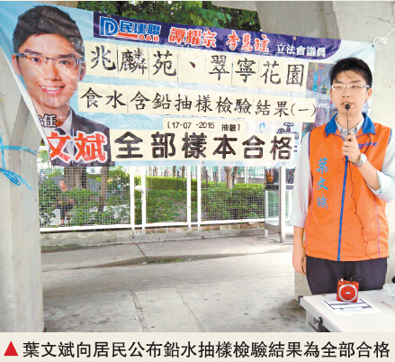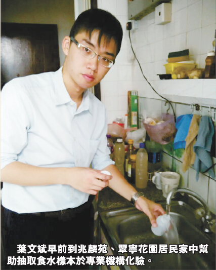 葉文斌說,支部義工於區內公屋、居屋進行抽取食水樣本231例,其中,以他服務的居屋兆麟苑、翠寧花園及私樓南浪海灣進行抽取食水樣本30例,送交「香港生產力促進局」進行化驗後,近日,該局完成檢驗食水含鉛量化驗結果,水樣含鉛量全部符合世界衛生組織訂立的國際安全標準,並無超標,令區內居民消除對食水安全的擔憂,現時檢驗食水含鉛量的工作告一段落。