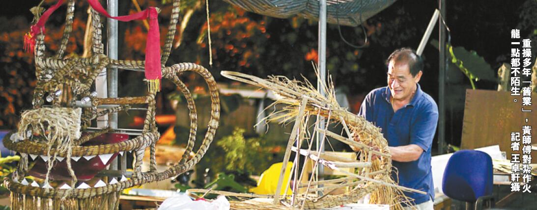 重操睽違40多年的「舊業」,黃師傅笑說紮起火龍一點都不陌生,更令他回想起童年的時光。他告訴記者如何由零開始紮火龍。首先要挑選上好的觀音竹製作龍頭,因觀音竹節點不多,而且質地較軟,容易拗出造型。萬事開頭難,黃師傅說削竹的時間比紮龍頭更長,一個龍頭需要耗掉兩支30呎長的竹,然後要削成足夠勻稱及扁平的竹片。用竹片拗出龍頭的輪廓,加上鐵線做龍鼻,電筒做龍眼,前後至少花費半天。