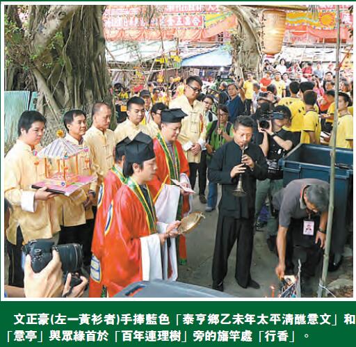 【香港商報網訊】記者周駿、鄭玉君報道:泰亨鄉乙未年(2015年)太平清醮於11月29日至12月4日(農歷十月十八日至十月廿三日)舉行,大會主席文貴連表示,太平清醮是人神共樂活動,與上屆清醮有別的是,回鄉參與今屆清醮的旅居海外文氏僑民多達九成,而本鄉年輕人亦積極參與會務工作,不單是人手增加,更重要的是傳承習俗后繼有人,而會前經費已有300萬元,醮會順利運作。從11月29日之后的一連5天6夜清醮吉課程序中,以正醮「迎人緣榜」、頭名緣首「行香」及大士巡圍吸引一批市民、游人慕名而來。