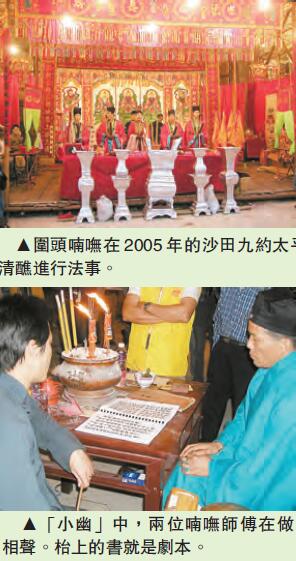 又如「小幽」,本意是個輕型濟幽儀式,但在誦經之后,兩位師傅會先做一場相聲才化衣,大講俏皮笑話稱作「賣雜貨」或「講鬼故」(按:因一年才做一兩次,師傅在默契上難免有點生澀)。這些上百年留下來的舊場口,在市區醮會早已絕跡,還慶幸在圍村得以生存。