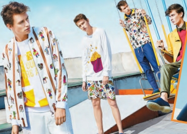 2016春的Cabbeen Lifestyle風尚系列從遊樂場中的馬戲團汲取歡樂配方。將其中極具代表性的元素,如抽象的條紋、波點、菱形,具象的雜耍演員、動物以及馬戲團的各種表演道具融入到服裝圖案當中。高亮的色彩多以組合的形式出現,結合透明視覺的工藝,如外層透明的外套,透出里層以塗抹筆觸表現的大色塊拼接;或以外層面料的鐳射沖孔、鐳射切割工藝,透出內層色彩,使服裝更有層次感,繽紛中帶來高街感十足的灑脫,極具視覺張力。直抒胸臆的文字和口號作為年輕流行文化的一種表現格外率性、直接,金錢和鈔票的圖案則帶出一些嘻哈風又包含一份戲謔,Cabbeen Lifestyle風尚系列今季也將之轉化成滿底印花的樣式,運用於T恤、輕便夾克上,讓遊走街頭的率性型男「有聲音」、「有態度」。