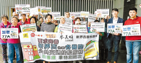 麥美娟(前左三)聯同元朗區議員姚國威(右一)、鄧焯謙(右二),及多名青衣、天水圍居民早前到政總請願,要求改善新界西往來醫院的交通接駁服務。