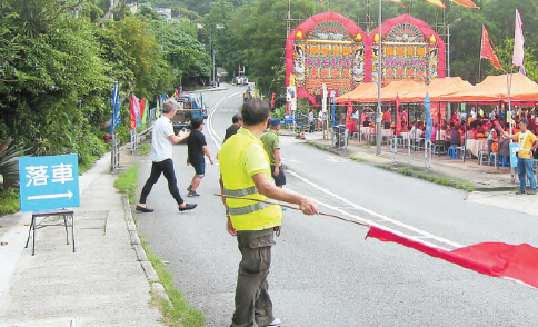 盆菜宴設在大網仔路旁,大會要派員維持交通秩序。記者 鄭玉君攝