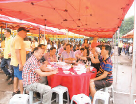 馬路旁帳篷下的盆菜宴,鄉民吃得開心。