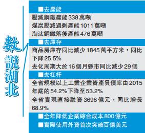 王曉東指出,湖北制定「1+N」總體方案,在去產能方面,去年壓減鋼鐵行業過剩產能338萬噸,安置職工1700多人,煤炭行業壓減過剩產能1011萬噸,提前2年超額完成國家下達任務,「三年任務一年完成」。去庫存方面,全省商品住房庫存面積同比減少1845萬平方米,去化周期大於16個月的縣市同比減少29個,去年商品房庫存面積同比下降了25.5%。去杠杆方面,截至去年11月末,全省規模以上工業企業資產負債率由2015年底的54.2%降至53.2%;全省直接融資3698億元,同比增長68.9%。
