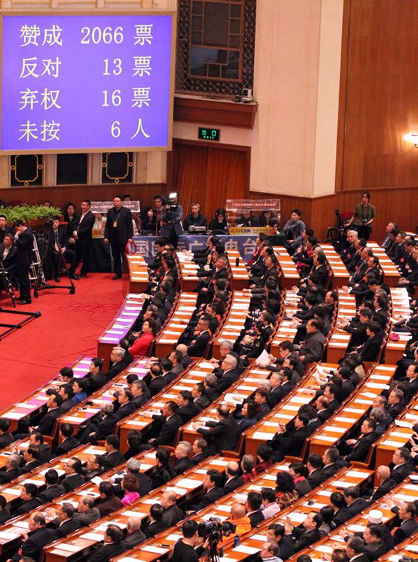 閉幕會昨早於人民大會堂舉行,在工作人員宣讀選舉辦法和副主席候選人名單後即進行選舉。表決結束後,工作人員宣讀結果:2066票贊成、13票反對、16票棄權,6人未按表決器。俞正聲當場宣布:選舉有效,梁振英委員當選政協十二屆全國委員會副主席。隨後,梁振英受邀到主席臺前排就座。梁振英走上主席臺,向臺上和臺下與會者致意,現場響起熱烈掌聲。