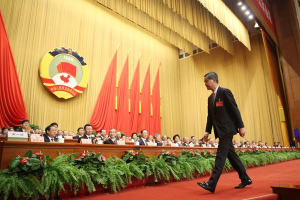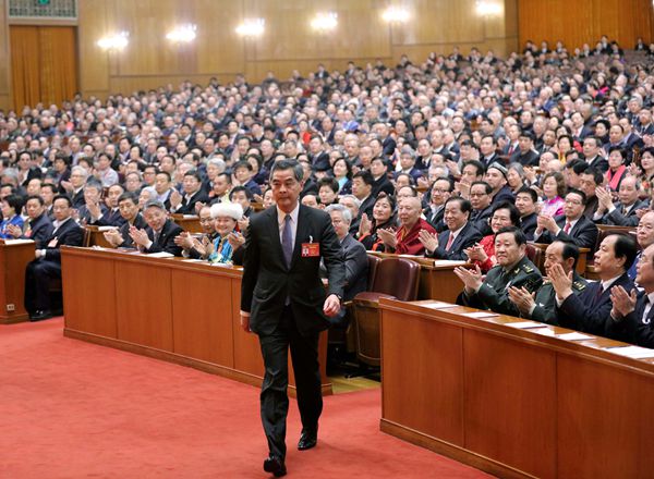 當選全國政協副主席後,梁振英從台下離座走向主席臺。
