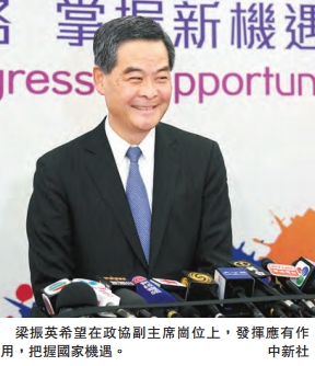 梁振英稱,自己重新回到全國政協的大家庭,希望接下來在全國政協副主席的崗位上,能夠發揮應有的作用,促使香港社會能更好地把握國家持續發展帶來的種種機遇,尤其是為青年帶來的機遇。他希望這能令個人以至香港整體的發展,都能借國家發展的東風而有更好的發展機會,同時能為國家盡作為國民一分子的責任,做好應做的貢獻。