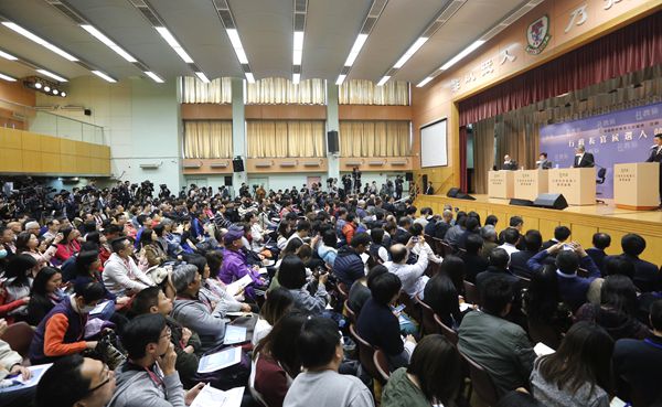 3位參選特首候選人昨日首度同台出席辯論,吸引到約450人出席。記者 崔俊良攝