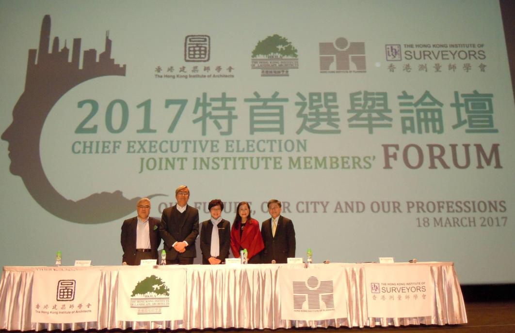 林鄭月娥(中)出席由建築師學會、園境師學會、規劃師學會及測量師學會舉辦的特首選舉論壇。 香港建築師學會Facebook圖片