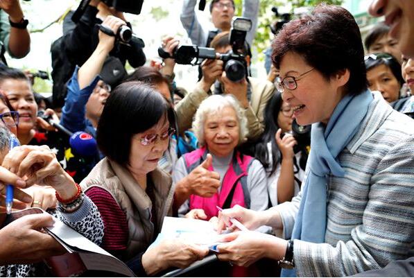 行政長官候選人林鄭月娥昨日到訪天水圍,盡顯親民一面。路透社