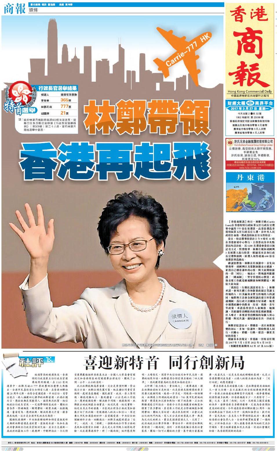 【香港商報網訊】昨日,林鄭月娥(Carrie Lam)在香港特別行政區第五任行政長官選舉中贏得777張有效選票,高票當選為香港特區第五任行政長官人選,在中央人民政府任命後,將成為特區首位女性候任特首。