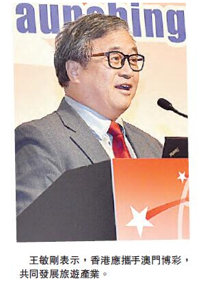 談及港珠澳大橋即將落成,香港與珠三角、澳門聯繫越發緊密,王敏剛就認為,這是香港攜手澳門發展旅業的好時機。他表示,「澳門已成為世界主要博彩中心,港珠澳大橋預期約3年後通車,讓香港享受博彩旅遊之利。」他指出,本港原有的旅遊品牌是「購物天堂」和「美食天堂」,雖然沒有博彩業,但港珠澳大橋通車後,香港去澳門的車程只有約20分鐘,訪港遊客可借此方便享受澳門的博彩旅遊,形成香港與澳門兩地旅業互相推動的格局。