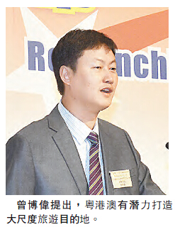 談及香港旅遊業可在「一帶一路」背景下獲得的新發展,曾博偉指,首先,香港可與內地共同建設世界級旅遊目的地。他指出,粵港澳是中國經濟最發達地區之一,具有豐富的旅遊資源和旅遊產品,有潛力打造成大尺度的旅遊目的地;而隨港珠澳大橋開通,香港、澳門及珠海的往來便利程度將大大提高,這三地也可建成小尺度目的地。