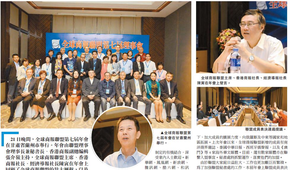 21日晚间,全球商报联盟第七届年会在甘肃省兰州市举行。年会由联盟理事会理事长兼秘书长、香港商报副总编辑张介岭主持,全球商报联盟主席、香港商报社长、经济导报社长陈寅在年会上回顾了全球商报联盟的壮大历程,以及在媒体、商界形成的巨大影响力。此次年会上,联盟成员表决通过了香港商报助理总编辑徐文(圆图)增补为副秘书长的提议,并决定将联盟理事会改选由原来的每届理事会一次调整为每两年一次。联盟成员在年会上积极交流互动,分享经验,并为联盟未来的发展建言献策。香港商报记者 伍敬斌