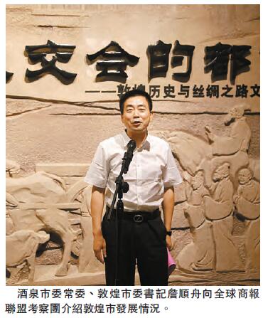 6月24日,第七届全球商报联盟考察团走进敦煌市,深入佛教艺术圣地莫高窟、「沙漠奇观」鸣沙山月牙泉和敦煌文化博物馆等地,进行了为期两天的考察活动,实地感受到了敦煌盛大辉煌的历史和博大精深的文化底蕴。酒泉市委常委、敦煌市委书记詹顺舟会见了考察团一行,并表示热烈欢迎,希望全球商报联盟能在海外华侨、华人地区传播敦煌文化、宣传敦煌,让更多的华人华侨了解敦煌,热爱敦煌。