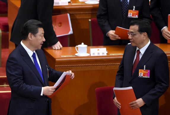 图:国家主席习近平和总理李克强15日在十二届全国人大三次会议闭幕会上交谈/法新社
