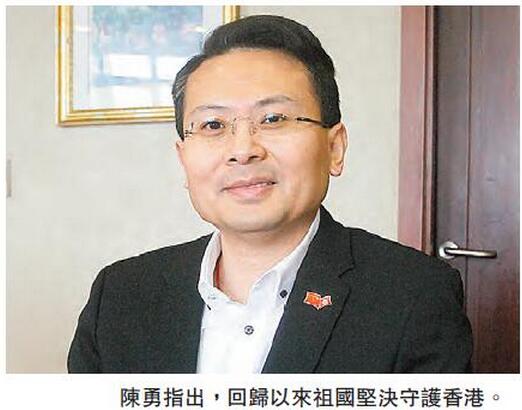 港区全国人大代表、新界社团联会理事长、民建联副主席陈勇,接受了本报访问。他认为,香港回归祖国19年以来,能平稳过渡,是人类历史上比较少有的。他称,中国以谈判的方式收回国土,是政权转移的典范;回归以後,香港面对金融风暴、非典型肺炎「沙士」、金融海啸等挑战,而祖国作为香港的福地,为香港提供大量机会,坚决守护住香港,大部分市民都能感受到。