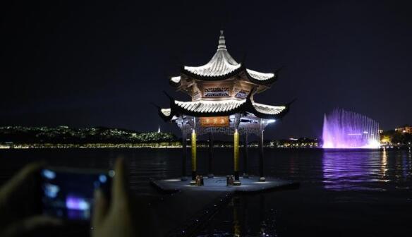 8月29日,游客在西湖集賢亭邊欣賞西湖夜色。傍晚的西湖邊,暮色與燈光交相輝映,市民和游客絡繹不絕。 新華社記者 鞠煥宗 攝