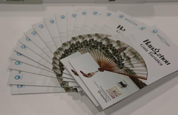 細節之處盡顯杭州元素。 9月1日,G20杭州峰會開幕前夕,峰會新聞中心處處體現著杭州元素。圖為介紹杭州的手册以扇子的造型擺設。