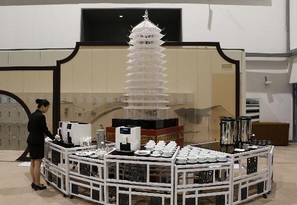 圖為新聞中心茶歇區的一座“玻璃雷峰塔”。中新社發 王剛 攝